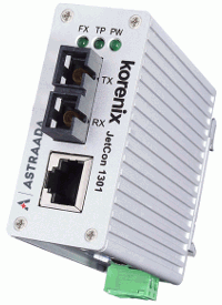 JET-CON-1301 jest kompaktowym konwerterem łącza ethernetowego na sygnał światłowodowy. Cechują go niewielkie rozmiary, bardzo małe opóźnienia w przekazywaniu danych oraz funkcja automatycznego przekazywania informacji o utracie połączenia (LLF), ułatwiająca wykrywanie awarii połączenia miedzianego.